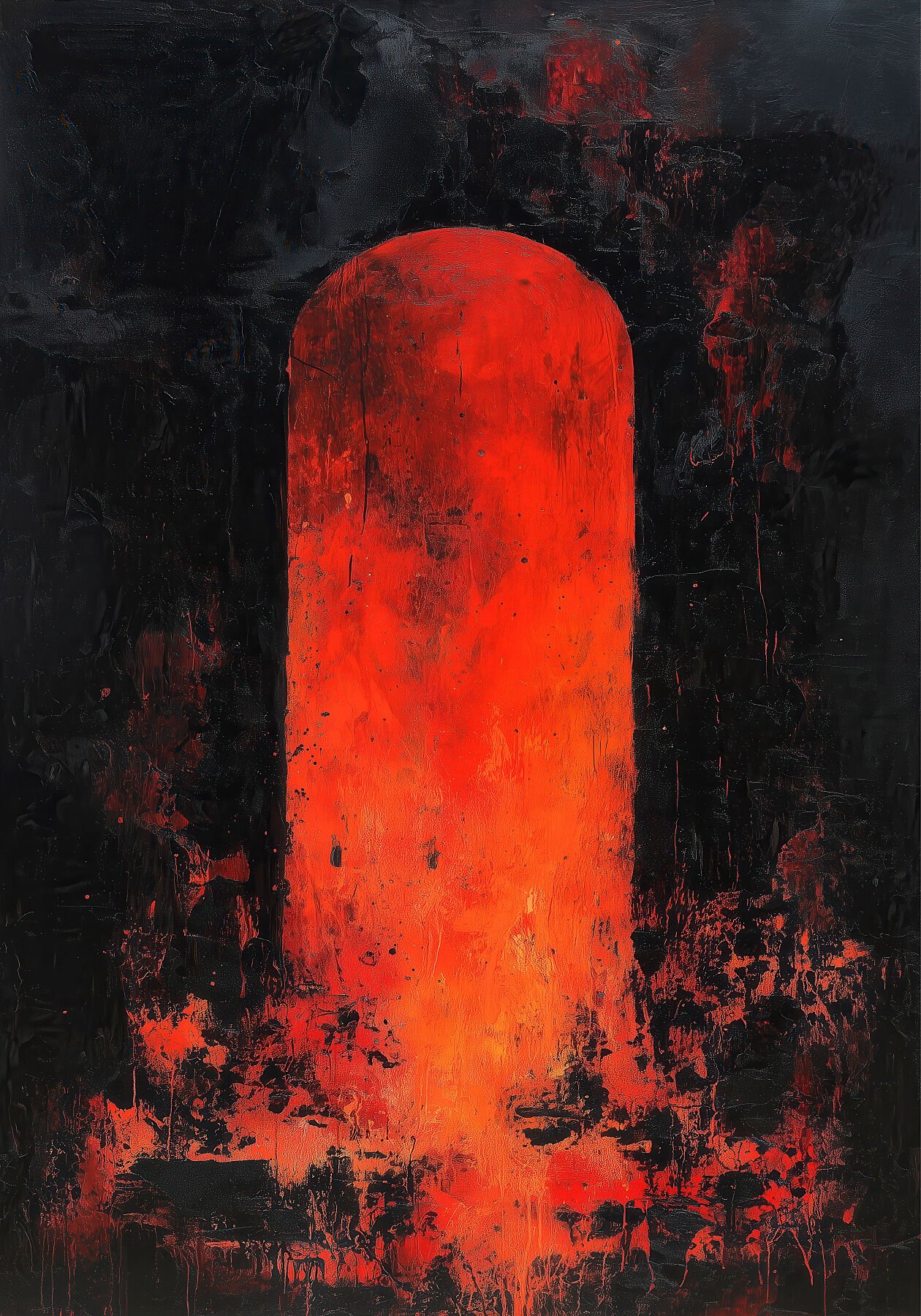 AGNI toma esa forma —el arco, el portal, el umbral— y la pinta con una gestualidad expresionista que no permite la elegancia ni la distancia contemplativa. Los trazos son urgentes, casi violentos. El arco no es una invitación serena: es una exigencia. Y a través de él, fuego. Naranja y rojo en su máxima intensidad, contrastando con el negro absoluto que lo rodea de un modo que resulta físicamente perturbador.