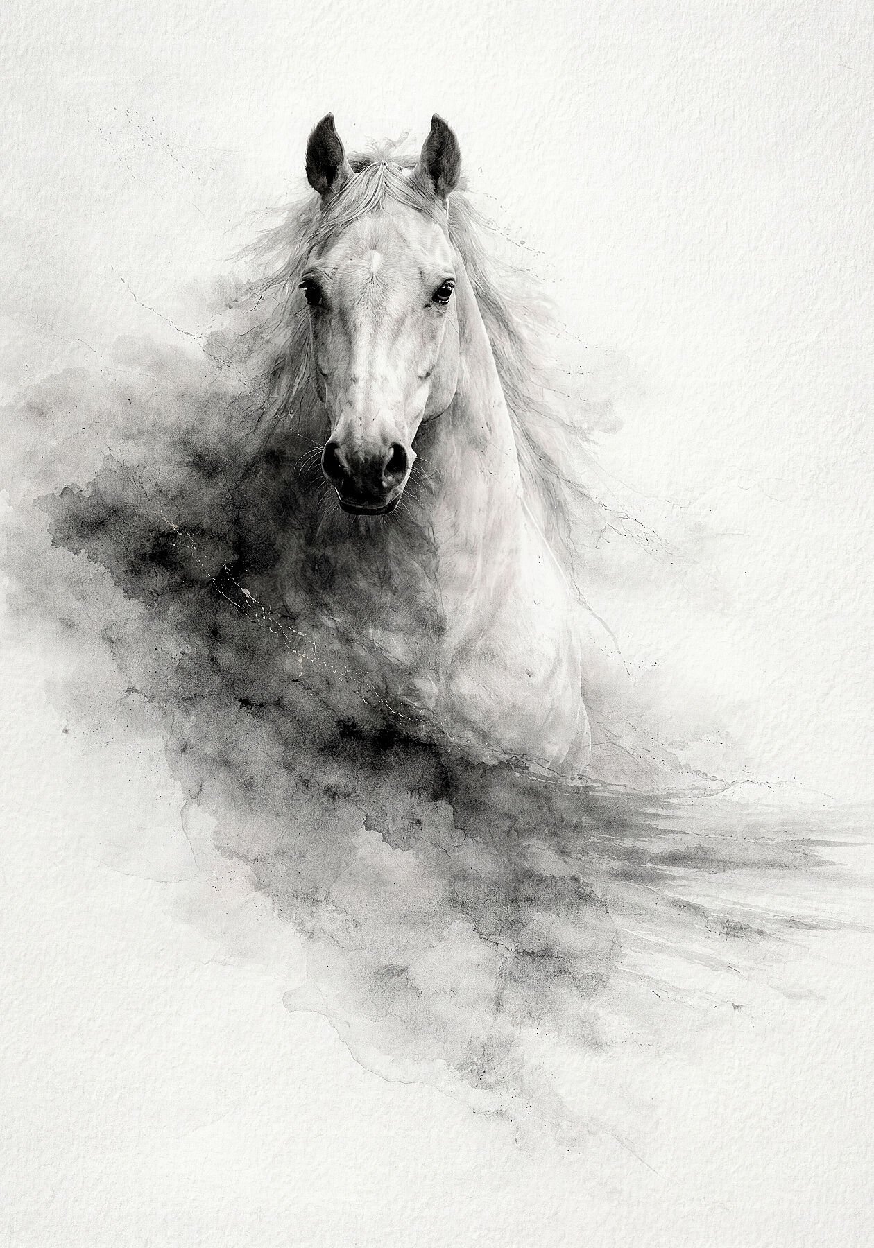 Argentum representa el espíritu del caballo blanco atravesando niebla y vacío. La composición frontal ligeramente descentrada genera tensión visual mientras la tinta diluida se desvanece en el papel.