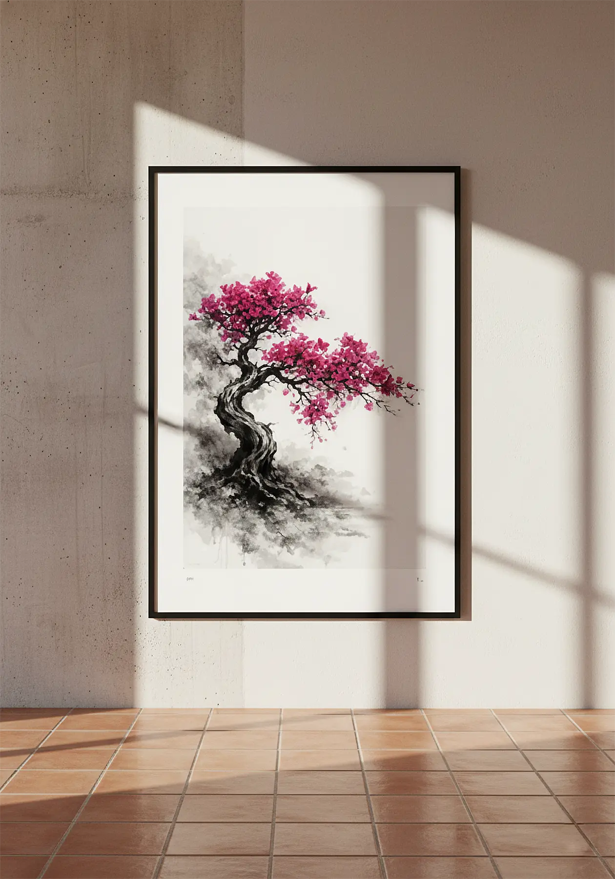 Bougainvillea es una interpretación contemporánea de la buganvilla en formato bonsái, realizada en tinta china y acuarela sobre papel fine art. La intensidad fucsia de la floración contrasta con la sobriedad del tronco y la bruma gris, creando una obra de equilibrio entre estructura y expansión.