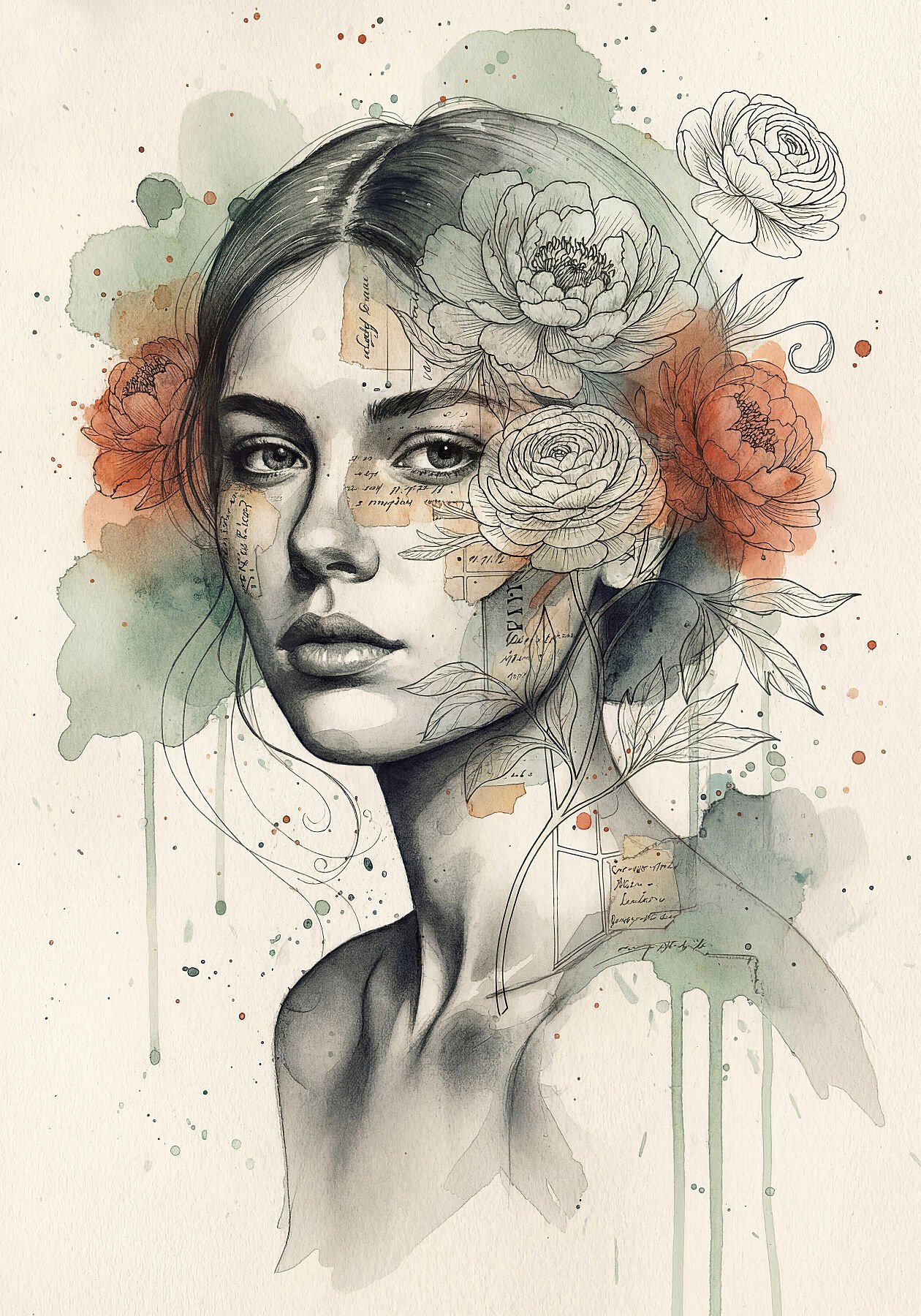 Technique: Digital artistic illustration with ink and watercolor aesthetics