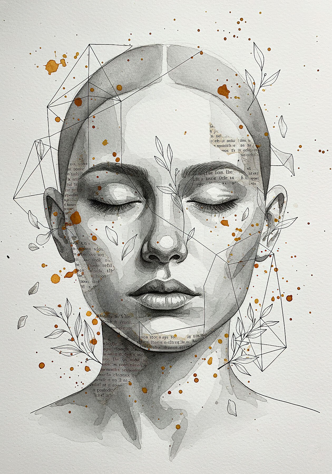 El rostro se convierte en un palimpsesto. No es una superficie limpia, sino un espacio atravesado por fragmentos de texto, geometrías incompletas y trazos botánicos que parecen flotar entre capas de significado. La identidad ya no se expresa de forma directa: se descifra.