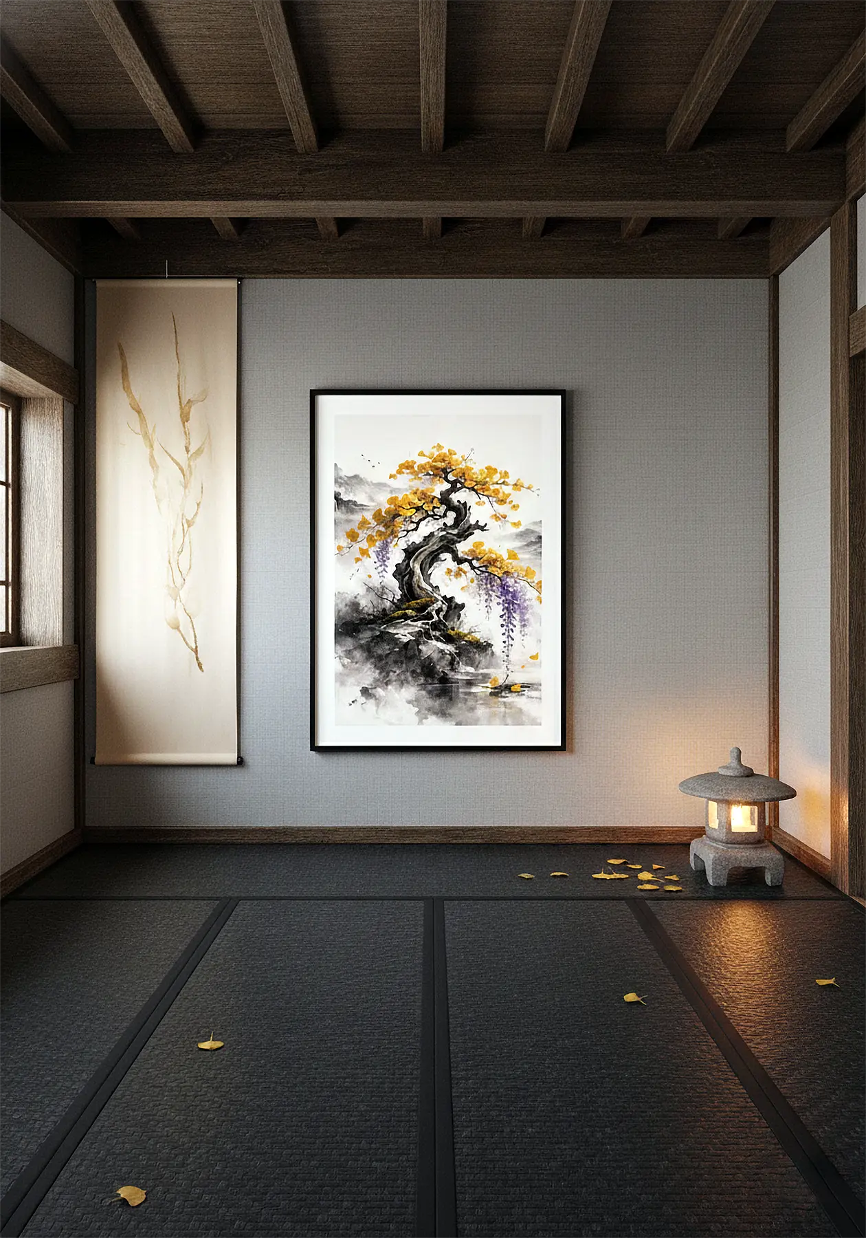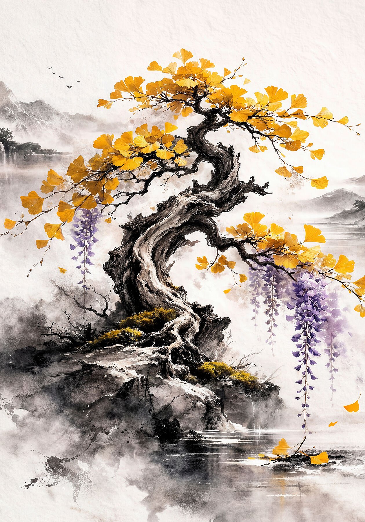 Ginkgo Biloba es una interpretación artística de una de las especies más antiguas y simbólicas del mundo botánico. Conocido como árbol milenario, el ginkgo representa longevidad, resistencia y equilibrio. En esta obra, su estructura se traslada al lenguaje visual de la tinta china y la acuarela, manteniendo una estética profundamente oriental.