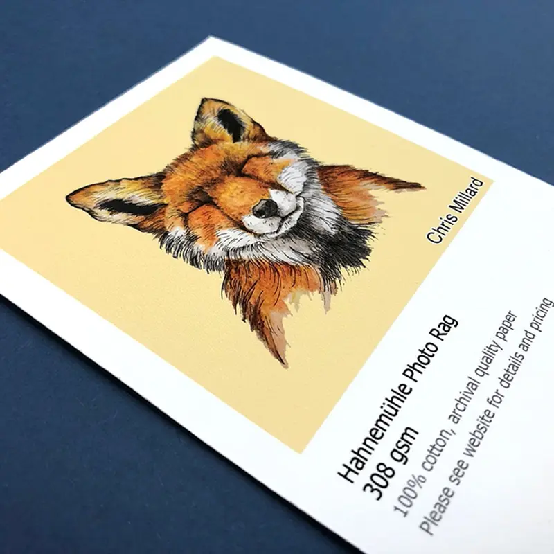 El Photo Rag 308 g tiene una textura leve pero perceptible — una microestructura que le da profundidad visual sin interferir con el detalle de la imagen. No es el papel liso de las reproducciones fotográficas comerciales, ni el papel rugoso de las litografías antiguas. Es un punto intermedio que el mundo del arte fine art ha tardado décadas en afinar.