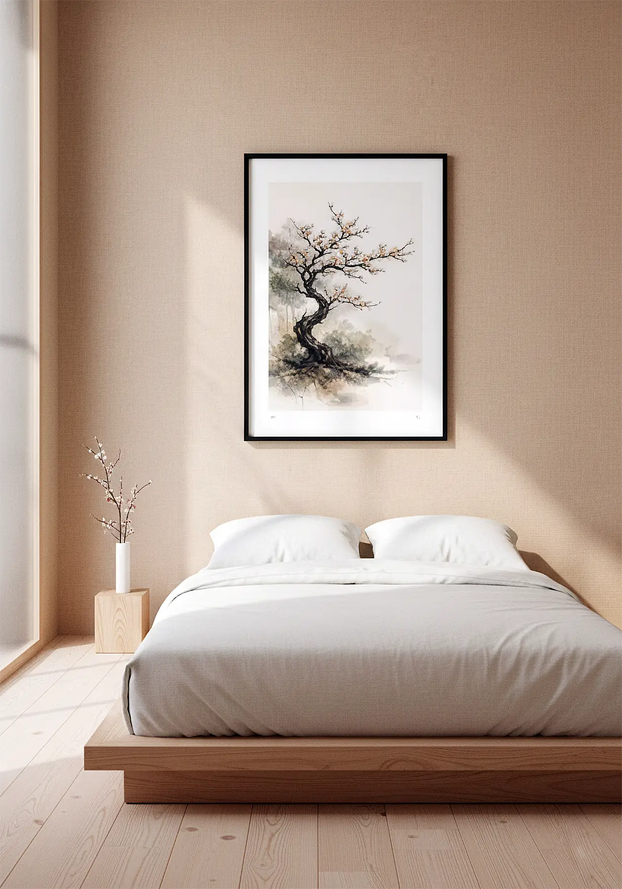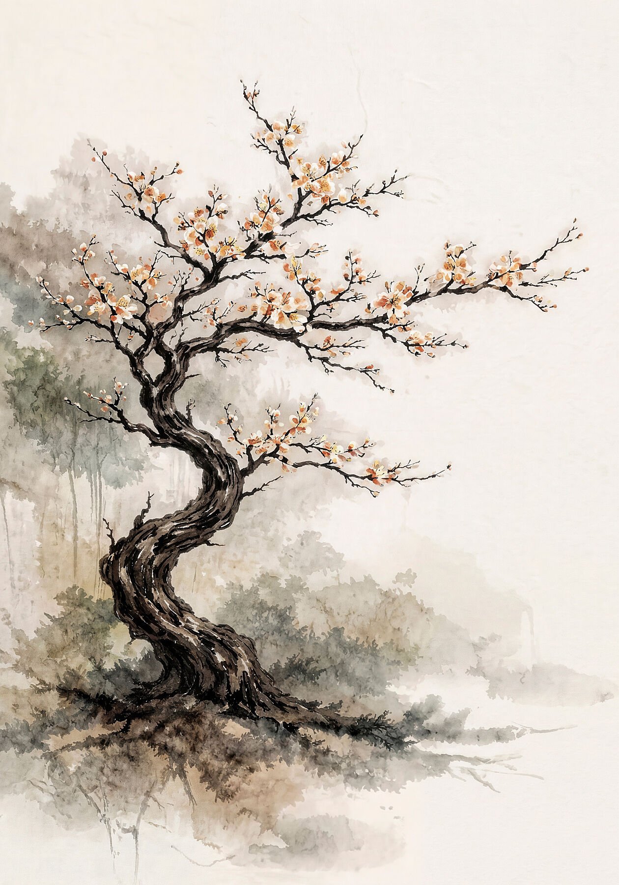 La composición equilibra fuerza y delicadeza: la estructura oscura del árbol ancla visualmente la pieza, mientras la floración introduce un punto focal luminoso que aporta dinamismo y profundidad. El fondo, tratado con lavados suaves y vegetación insinuada, genera una atmósfera etérea que refuerza la estética minimalista oriental.