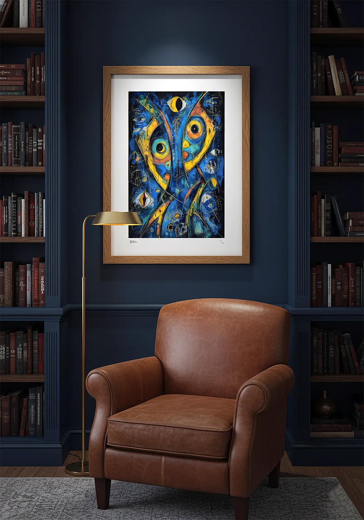 El ojo —símbolo universal de la conciencia, la vigilancia, lo sagrado— se multiplica en Vigía hasta convertirse en algo que ya no es humano del todo. Azules nocturnos, ambarinos que pulsan como luces de advertencia, grafías que arañan la superficie: la obra habla de una percepción que excede lo individual.